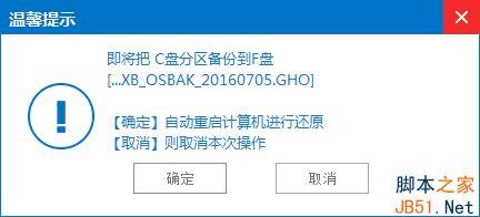 2、在弹出的提示框中确认系统盘区以及备份目标盘区无误后再次点击“确定”按钮,电脑将会进入重启状态并开始进行系统一键备份;