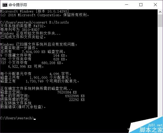 修复完毕,重新在提示符下输入转换命令进行转换,根据U盘空间大小以及存储文件的多少,进行转换时间也长短不一。
