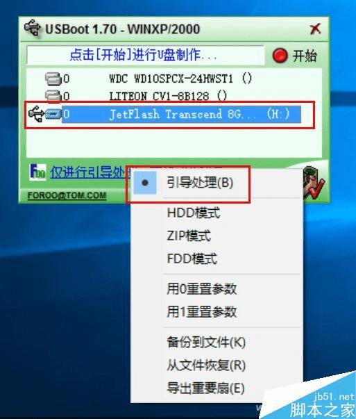 下载运行USBOOT程序,选择要修复的U盘及工作模式(引导处理),然后点击“开始”按钮即可。