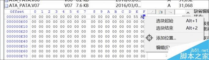 跳转到7扇区后,按键盘的向上键找到0000 0DF0一栏的55AA,在最后面的A那里点右键,选择选块结束