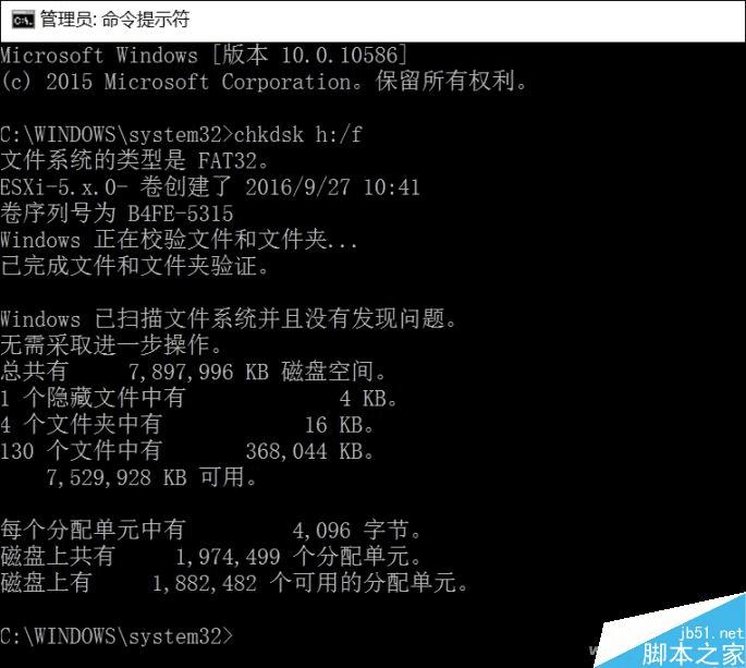 比如小编的问题U盘是h盘,所以修复这个h盘就需要输入“chkdsk h:/f”这个命令。
