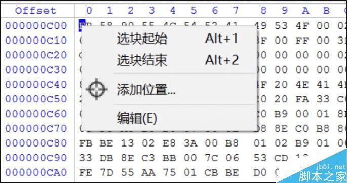 在offset找到0000 0C00一栏,用鼠标选中E,然后右键选择选块起始位置
