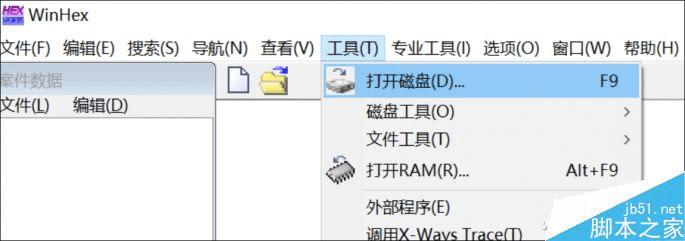 以管理员身份运行WINHEX程序,选择工具---打开磁盘