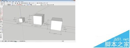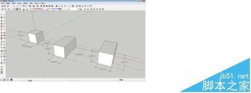 做为参照物,通过比较方便发现其中的变化(并标注相应的尺寸);选中立方体,移动(M)+ctrl,复制一份(本教程复制的立方体放大系数都为2倍);选中复制的立方体,点击缩放工具(S),会出现绿色的点(如图左起第二个)。