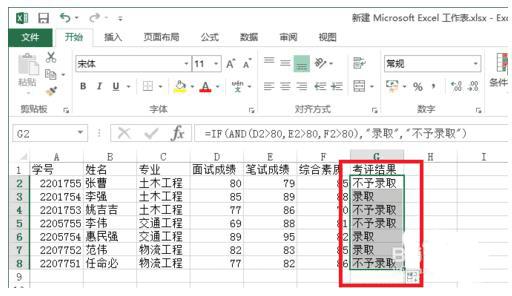 1、如图所示,and函数一般和if等逻辑函数结合起来使用。这里用来判断考评结果是否给予录取。=IF(AND(D2>80,E2>80,F2>80),"录取","不予录取")。公式含义如果面试成绩,笔试成绩,综合素质分数都大于80,给予录取,否则不予录龋