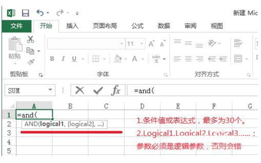 =and(logical1,logical2, ...),其中Logical1, logical2为判断条件