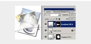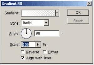 7、按D键重置前景色和背景色,X键互换颜色,为选中的图层增加一个渐变填充图层(图层>新建填充图层>渐变),在新图层中会出现和所选图层一样形状的蒙版。在填充选项框中,将大小比例改为150%,调整其他参数。