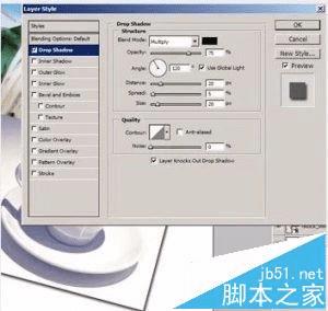 5、右键复制该图层的图层样式,粘贴到其他图片中去。左键双击图层图标,带出阴影编辑,为不同层的图片改变成不同的投影距离值,可以为每层投影距离增加5。这时我们得到了带阴影的图片。