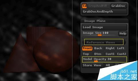 当你需要导入参考图片对模型进行雕刻制作时,通常会使用Image Plane插件将参考图导入作为背景。点击Load Image按钮即可导入参考图,默认导入进来的图片是位于模型之后的,如果此时想要对应后面的参考图进行建模和雕刻,而前面的模型又会遮挡住后面的图片,这时可以使用Reference Views下的Model Opacity参数将前面的模型变半透明显示。
