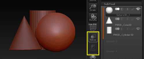 激活Transp功能按钮可以使除当前选择物体以外的所有物体都变为半透明显示,如果场景中有多个SubTool层,则物体将透明化显示当前作用的层,并将遮住的部分显示出来。此功能便于用户观察被遮挡住的模型。