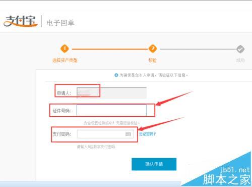 4、按照页面的要求填写身份证号以及支付密码(六位数字)等信息,然后点击“确认申请”按钮。