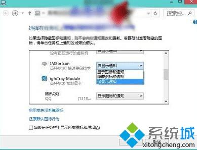 2、在通知区域图标窗口,找到IAStorIcon,点击后面的向下按纽,点击选择里面的“显示图标和通知”或者“仅显示通知”。