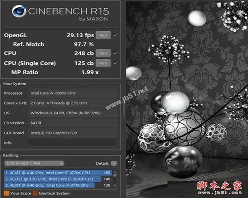 处理器性能方面我们采用三款同系列测试软件CINEBENCH对其性能测试,得出的结果仅供参考。在CINEBENCHR15测试中,该处理器多核心获得248cb,单核心125cb,处理器单项测试结果表面该处理器定位于移动平台处理器中高端型号。足够强劲的性能可以保证平时工作的正常运作,流畅不墨迹。