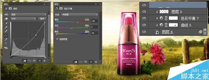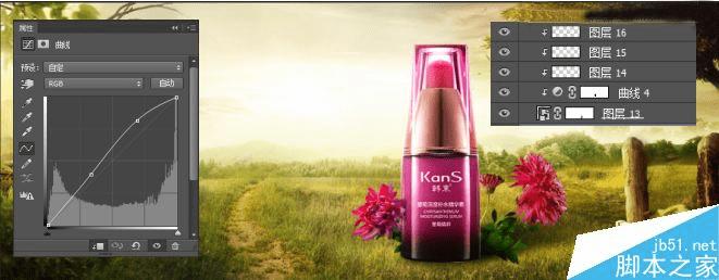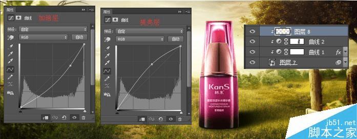 接下来我们导入产品素材,用钢笔工具将产品抠出同时给产品添加两个曲线调整层,一个是加亮曲线层一个是加暗曲线层。然后根据整体光效将不需要提亮或加暗的部分擦除,同时新建一层给产品添加受光面这里我们还是运用的浅黄色画笔图层混合模式为柔光。然后根据光照我们给产品添加投影这里我们可以直接用黑色画笔绘制,然后通过图层蒙版做出投影的虚实效果。(最好投影复制一层,给予不同的透明度这样会使投影更加具有层次感)