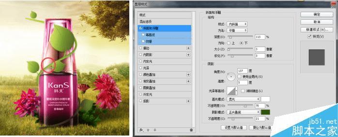 接下来为了增强主题产品的关注度这里我给瓶体上添加了一根藤条。藤条绘制还是要花一定功夫的,这里我用钢笔绘制藤条,把形状填充关闭只保留描边填充根据瓶体大小给藤条相应的粗细(这里我给了10px的粗细),把条的大形绘制好之后,给枝条添加斜面浮雕的图层样式。用图层蒙版擦出藤条缠绕的效果。
