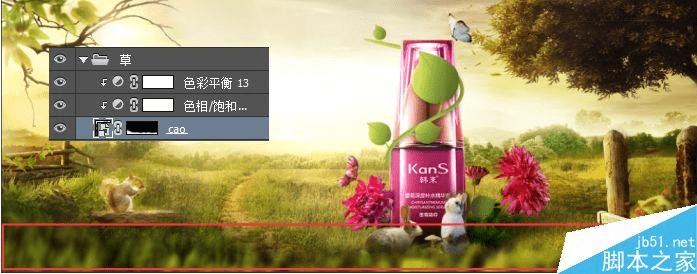 为了使得产品放在草地上的效果更自然,这里我们将产品和菊花进行编组,然后给组添加蒙版,用草形画笔擦出草遮挡的效果(这里我们选择134的笔头进行涂抹)