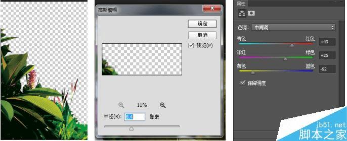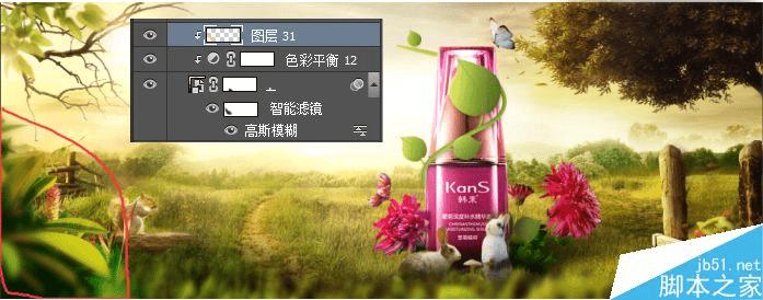 添加左下方枝叶,通过高斯模糊给枝条制作虚实效果(尽量将图片转换为智能对象后进行高斯模糊这样数值可以随时调整还可以对图片的模糊进行局部调整。)