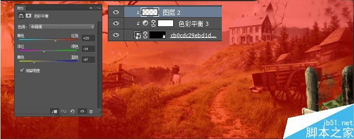 这里我们就不能用画笔来进行蒙版擦除了,必须用钢笔工具精细的将栅栏部分抠出,同时给图片添加色彩平衡调整层,根据整体画面的光照还要给栅栏添加亮面,这里我是新建一层在栅栏的上方用浅黄色画笔涂抹受光面,同时为了效果更自然这里我们将混合模式设置为叠加。