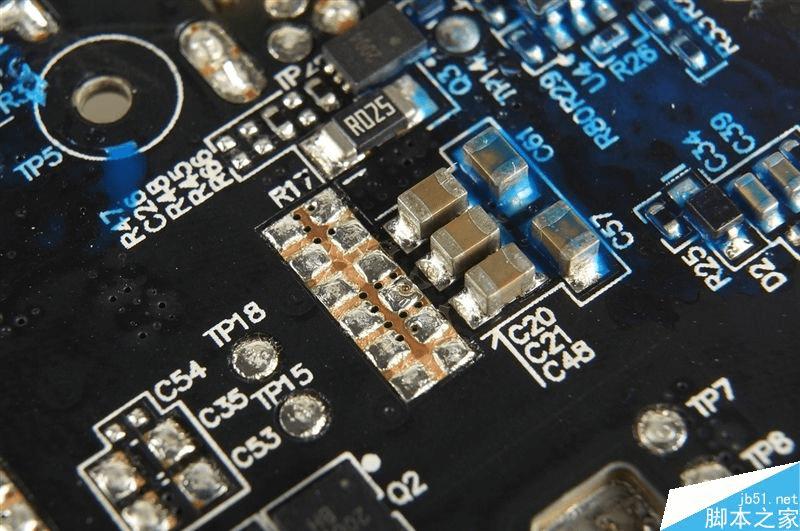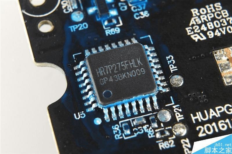 PCB正面一览,可见多处使用了防潮披覆胶,潮湿天气可以防止水汽在插孔分析进入后导致短路损坏。