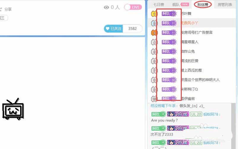 2、打开直播间,在右侧有个粉丝榜的切换菜单,点击之后,就会显示出该主播的粉丝排行,以及佩戴的主播徽章;
