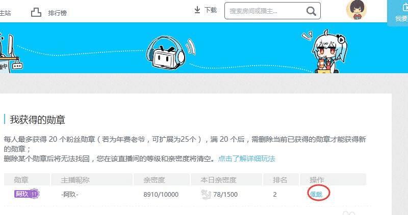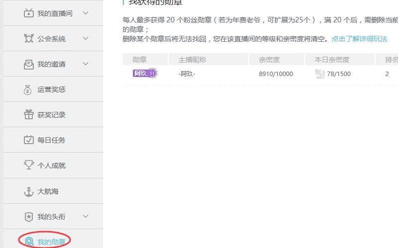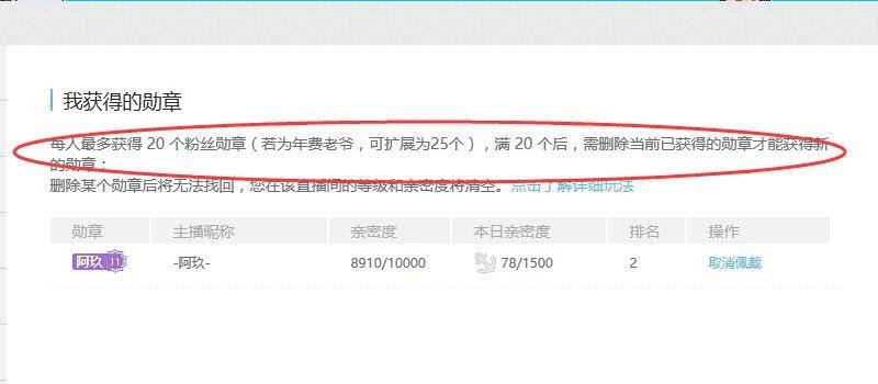 3、普通用户的主播徽章默认获取量是20个,若为年费老爷,可扩展为25个。若删除某个勋章后将无法找回,且在该直播间的等级和亲密度将清空。