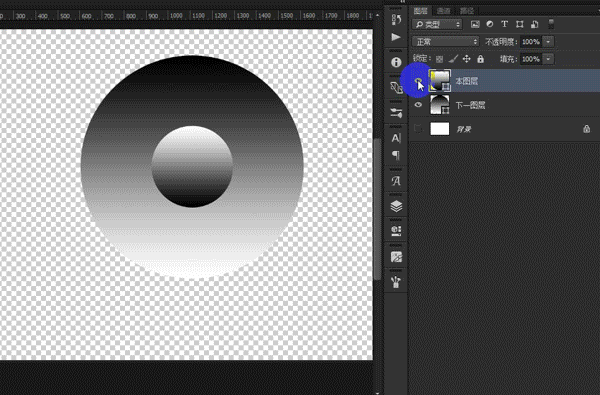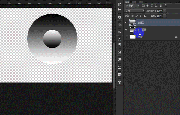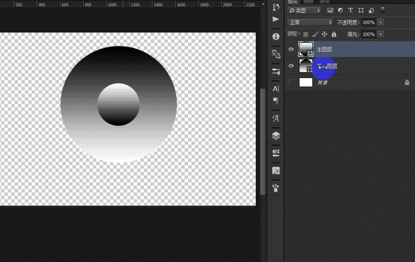 在整个滑块逐步向右拖的过程中,图像渐变圆球黑色的部分消失;这就说明整个滑块(未分开时)左侧的区域被隐藏了,而整个滑块右侧(未分开时)的区域任然显示出来。此时如果将整个黑滑块分开(按住ALT键),那么左半个和右半个滑块中间将会产生一个过渡的区域,这个区域很像我们熟悉的"羽化"或者"容差"的概念,起到一个过渡的作用,不至于图像被隐藏的边缘太生硬。