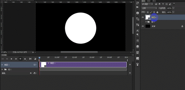 c、最后我们想让唱片的高光出来,那么在它的上面做一个圆形(90*90px,什么颜色无所谓),将填充改为0,同样的方法为其添加一个白色渐变叠加的动画,将它开始的时间放在唱片遮罩之后。