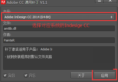 8、打开Adobe CC通用注册机,选择对应系统的“Indesign”,点击应用