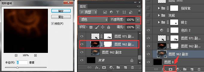 6、对场景复制一层,在新的图层对原画进行高斯模糊处理。图层选滤色属性,在模糊的这个图层增加滤镜蒙版进行擦除,把不需要模糊的地方用画笔擦掉,这个方法可以让场景增加景深效果。
