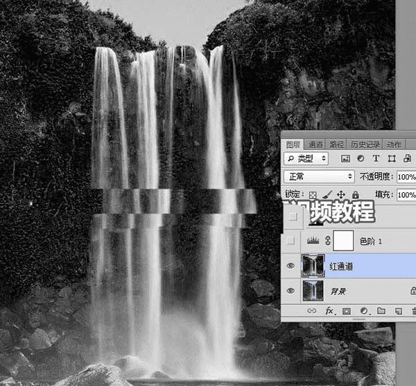 红通道:瀑布颜色较亮,背景颜色较暗,对比极强,比较理想。