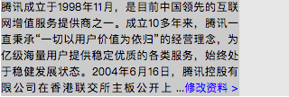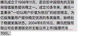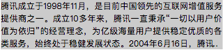 腾讯成立于1998年11月,是目前中国领先的互联网增值服务提供商之一。成立10多年来,腾讯一直秉承“一切以用户价值为依归”的经营理念,为亿级海量用户提供稳定优质的各类服务,始终处于稳健发展状态。2004年6月16日,腾讯控股有限公司在香港联交所主板公开上市(股票代号700)。