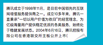 腾讯成立于1998年11月,是目前中国领先的互联网增值服务提供商之一。成立10多年来,腾讯一直秉承“一切以用户价值为依归”的经营理念,为亿级海量用户提供稳定优质的各类服务,始终处于稳健发展状态。2004年6月16日,腾讯控股有限公司在香港联交所主板公开上市(股票代号700)。</div>