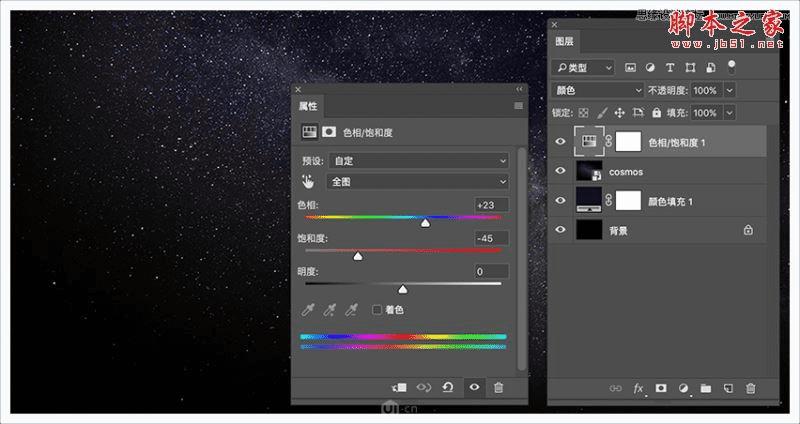 步骤3:添加色相/饱和度调整图层,并将其混合模式更改为颜色。 色相值更改为23,饱和度更改为-45。