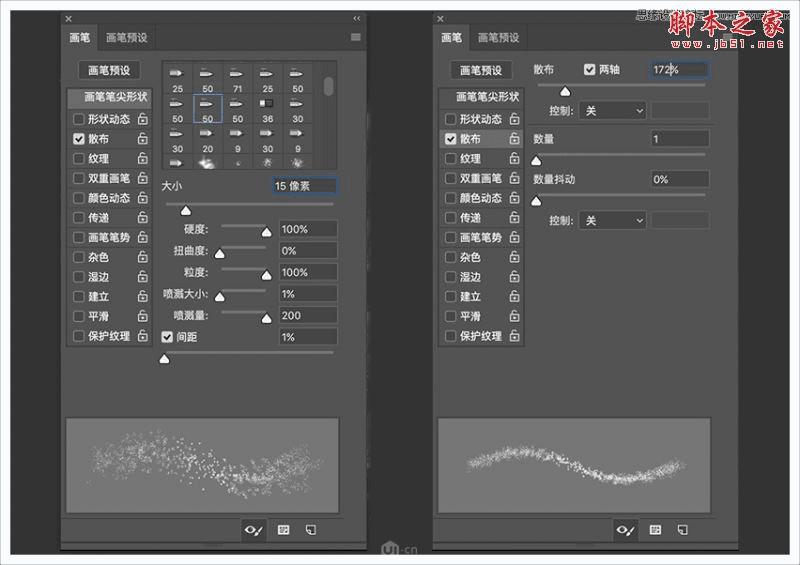 步骤4:更改画笔笔尖形状和散布设置,如下所示: