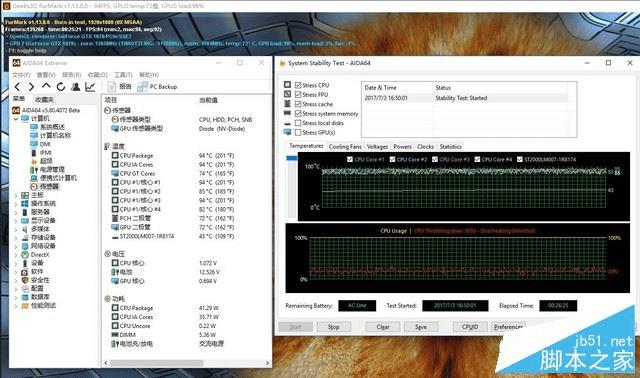 我们使用AIDA64以及Furmark对其进行了双拷机测试,从传感器温度可以看到,拯救者Y920处理器在满负载状态温度为94℃左右,显卡满负载状态为72℃,散热还是比较不错的。