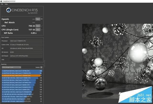 通过CINEBENCHR15的测试可以看出,酷睿i77820HK相对于上一代酷睿i76820HK还是有较为明显的性能提升的,其中单核达到157cb,比上一代提升13分左右,四核达到766cb,比上一代80分左右。如果对其进行超频,性能提升幅度还会更大。