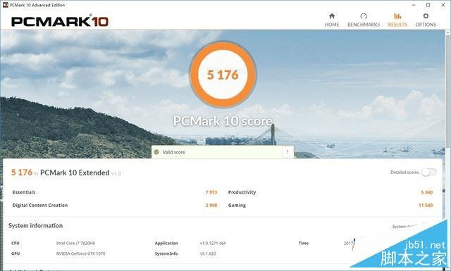 在综合性能测试方面,我们使用了最新的PCMark10软件。测试项目为Extended,包含了文档、视频、图形、游戏等全面测试项。从结果来看,联想拯救者Y920得分高达5176分,性能表现非常出众。