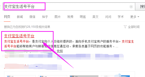 1、打开浏览器,输入“支付宝生活号平台”进行搜索。找到官网地址并点击。