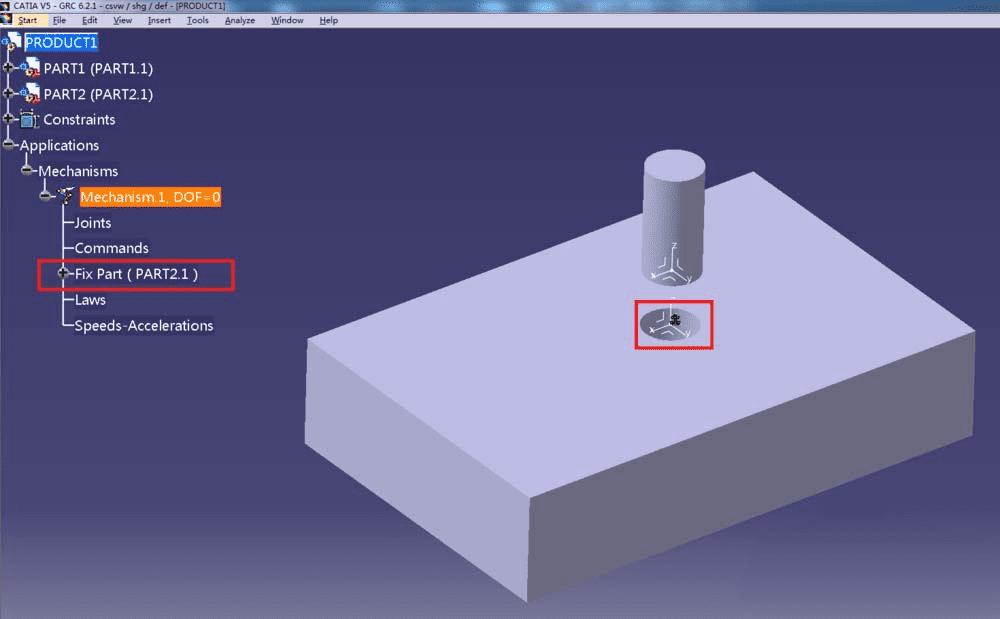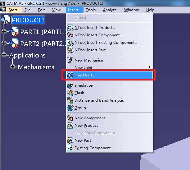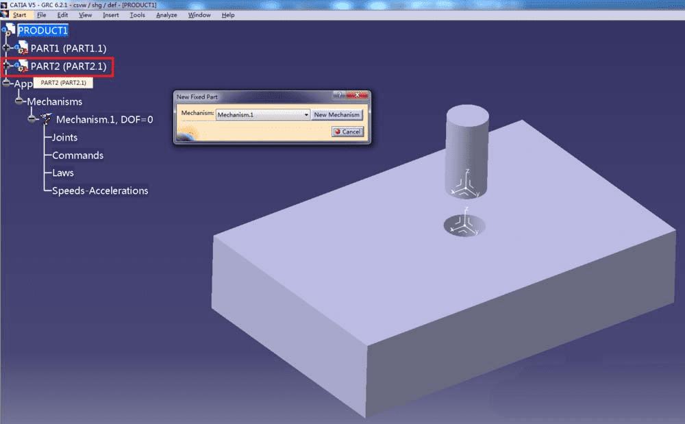 5、每个机构都必须有且仅有一个固定件Fixed Part,点击Insert新建一个Fixed Part,注意在弹出的对话框中选择对应的机构,目前图中对应的是Mechanism1,然后点击一个零件作为固定零件