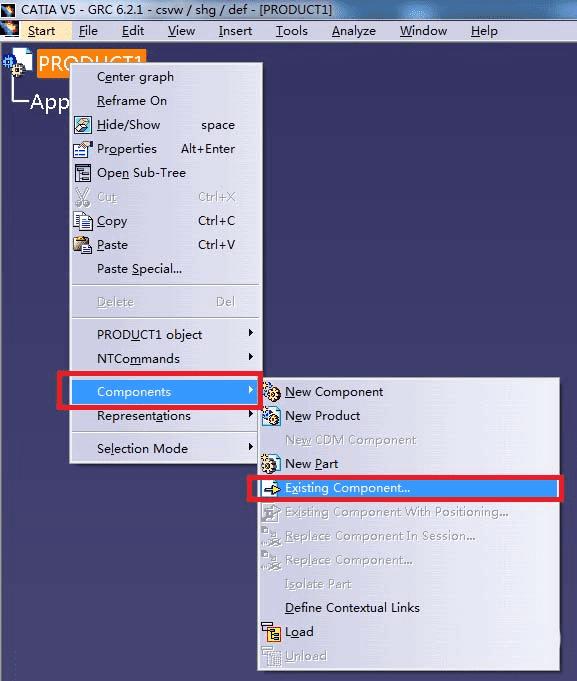 2、然后右键点击Product,按图示方法导入各个零件。