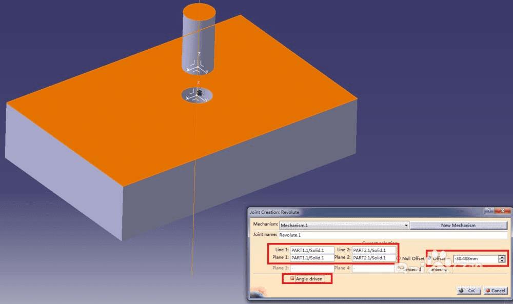 8、在对话框中,两条line分别选择圆柱的轴线和圆孔的轴线(轴线可以通过点击圆周面来选择),两个plane分别选择图中高亮的两个面,根据实际情况选择性勾选offset,然后在Angle Driven前面打上勾,表示这个机构的运动来源是这个铰链的角度在动,由于之前已经定义过固定零件,所以我们知道肯定是圆柱在动了。