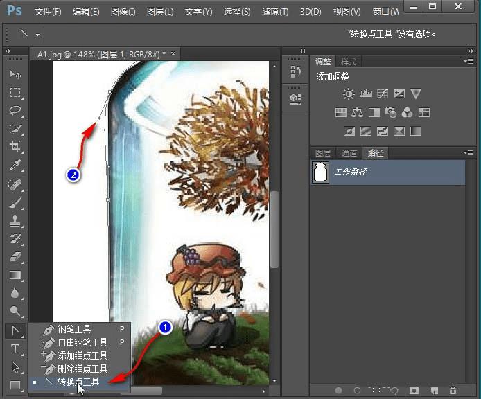 10、之后,将图片放大(Alt+滚轮),右键点击钢笔工具---转换点工具。
