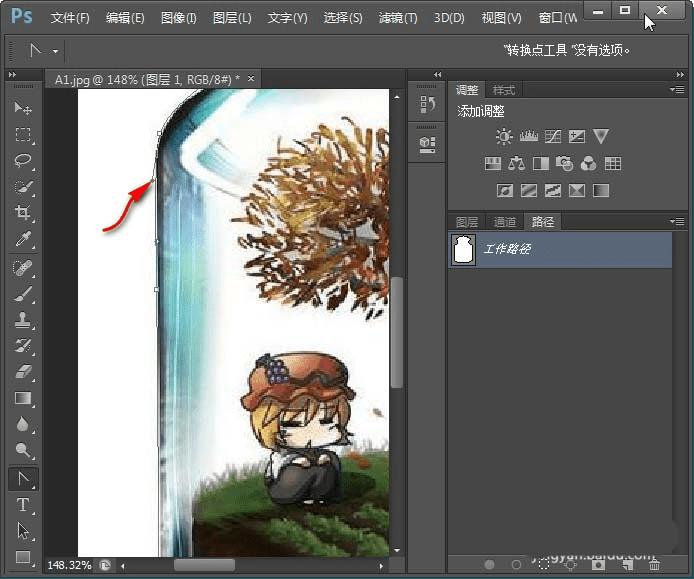 11、用转换点工具先点击一个路径,在出现的手柄上点击进行调节。