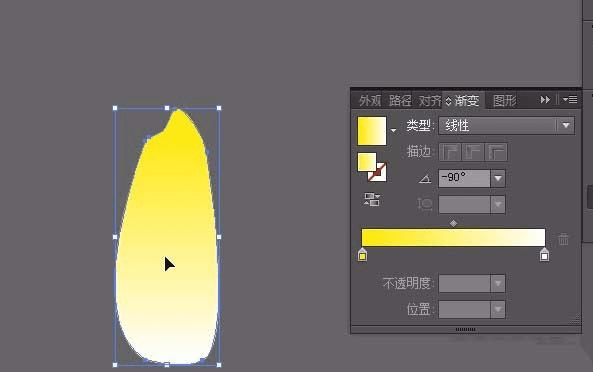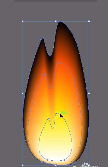 13、用钢笔工具绘制一个火焰。并填充线性渐变色①#ffe700②#ffffff;按ctrl+C,CTRL+B黏贴到后一层。按shift+alt键,拉大一些。填充 ①#ff5000②#fcbc42 ,角度为-90°。按ctrl+C,CTRL+B黏贴到后一层。按shift+alt键,拉大一些。填充 ①#000002②#000000;用直接选择工具调整。到如图。