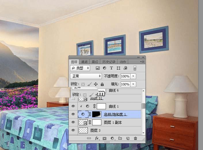 31、用套索工具勾出房间背光区域选区,羽化65个像素后创建色相/饱和度调整图层,适当降低明度,参数及效果如下图。