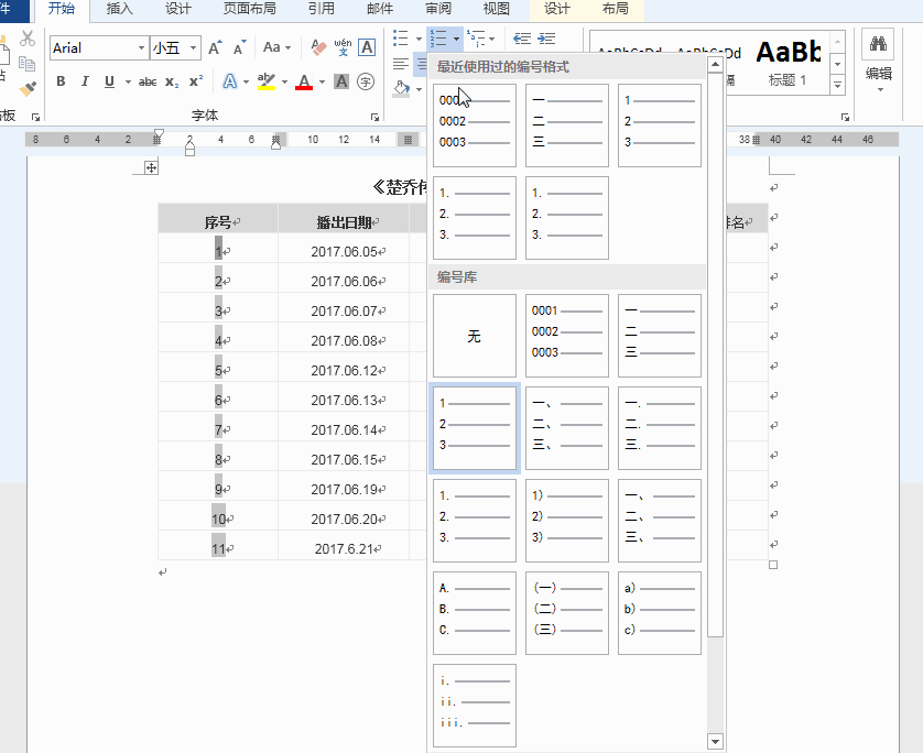 1、首先选择需要添加需要的表格,点击开始选项卡自动编号中的数字。