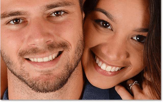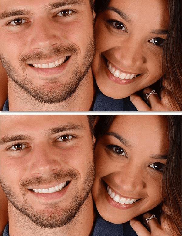 将照片放大,我们看到两个人在他们的牙齿上都显示出一点黄色。我们可以美白他: