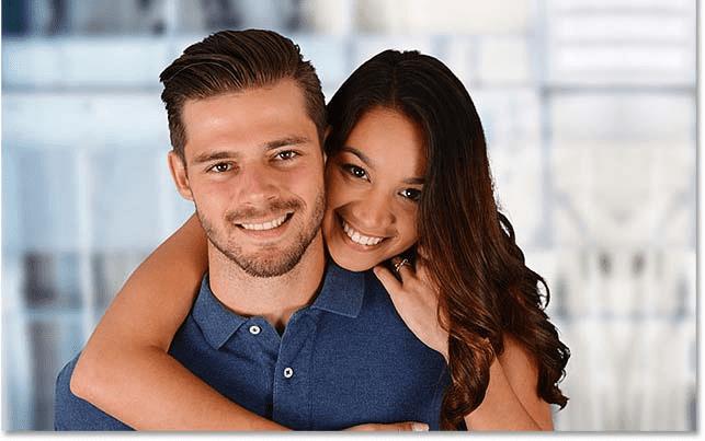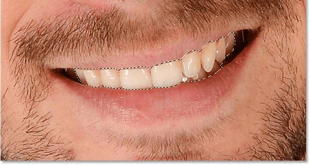 如果您一次只处理一个人,每个人都有一个单独的色相/饱和度调整图层,您将获得更好的结果。我要从左边的那个男人开始,随着美白和牙齿变亮,我会一路覆盖每一步。然后,我将使用单独的色调/饱和度调整图层,对右边的女人快速应用相同的步骤。首先使用套索工具选龋