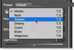 如果我们要调整牙齿,只需要调整黄色就可以了,而不需要调整其他的任何其他颜色。要做到这一点,请点击当前所说的“全图”框,然后从列表中选择黄色: