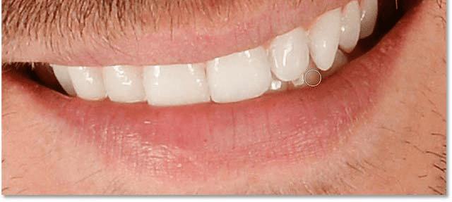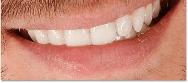 随着画笔工具在手和黑色作为前景颜色,涂在牙齿周围清理任何问题的地方。你可以使用一个小而软的刷子,从键盘也可以调整画笔的大小,要使刷子更小,请反复按左括号键([),要使其更大,请按右括号键(])。要使刷子的边缘更柔软,请按住Shift键并反复按左括号键。要使边缘更硬,请按住Shift并按右括号键。